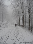 Když jsem se nakonec vydrápala nahoru na Pustevny, naskytl se mi úžasný výhled na kopce okolo. Jo, tohle je ráj. Svůj pomocný klacek jsem láskyplně odložila u rozcestníku a vydala se do místní malebné hospůdky, s malebným interiérem. Ledva jsem se usadila ke stolu, venku se pomalu plíživě změnila atmosféra. Nejdřív se přihnal mrak a začalo drobně pršet. Pak padat kroupy a nakonec chumelit tak, že nebylo téměř vidět na krok. Dojedli jsme, co jsme měli objednané a vydali se na zpáteční cestu. Během pěti vteřin se z nás stali pochodující sněhuláci a vločky vířily kolem nás ve zběsilém tanci. Krajina se okamžitě proměnila v bílou pláň a sníh pokrýval každičkou větévku, stéblo trávy i hlavičky devětsilu. Začala jsem opět zaostávat: vítr mi hnal vločky do očí, což znamenalo, že jsem přes vizor brzy vůbec nic neviděla a zahalila mě bílá tma. Jak jsme sestupovali níž, měnilo se i množství a charakter srážek a nastoupila mlha. To ovšem neměnilo nic na tom, že kdo neměl nepromokavé oblečení, byl brzy "durch". Zpátky do hotelu jsme nakonec dorazili všichni a po krátkém rozloučení se vydali zpátky domů.